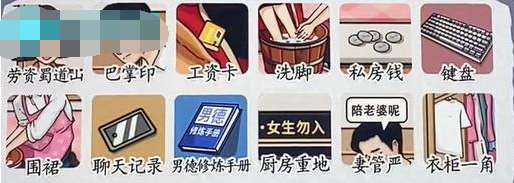 挑战巨人家庭弟位答案:妻管严、衣柜一角、工资卡、洗脚、围裙、键盘、巴掌印、厨房重地、男德修炼手册、聊天记录、劳资蜀道山、私房钱