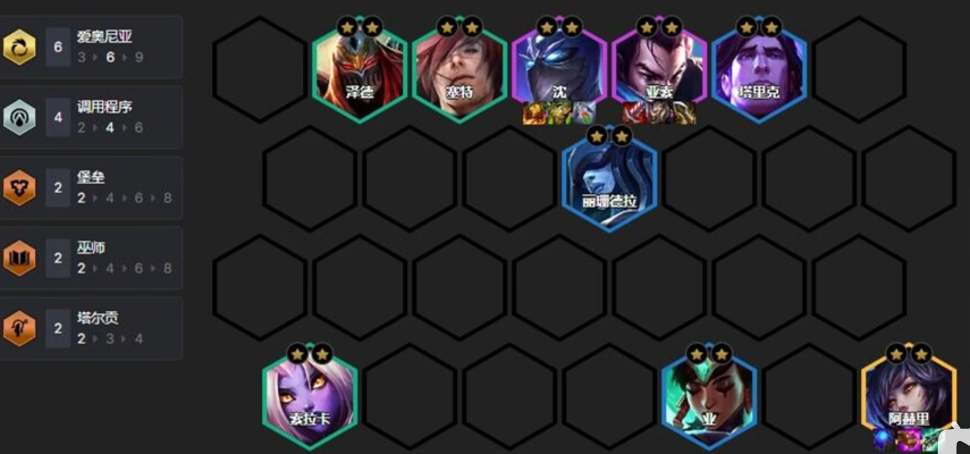 1、阵容构成:阿狸+慎+烬+艾瑞利亚+劫+瑟提+亚索+卡尔玛+奎桑提