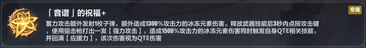 开局首选。大幅度提高时雨绮罗蓄力攻击的倍率,使用武器技后可以打出被视为QTE伤害的【强力攻击】,且回满动能条。