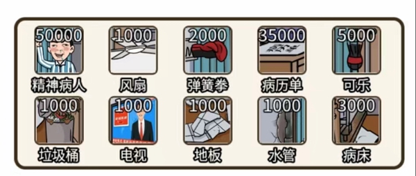 答案:精神病人、垃圾桶、风扇、电视、弹簧拳、地板