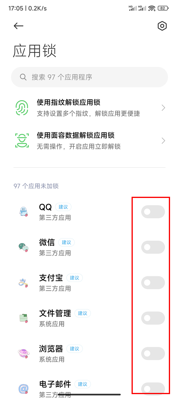 3、进入应用锁设置页面后,将需要设置应用锁的软件开关开启即可。