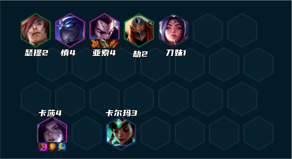卡莎或亚索任意2星可以考虑上8。8人口补上狼人开4挑战。然后慢D4费卡3星,没狐狸用劫代替。卡莎亚索装备神装以后优先做慎的肉装。有多余装备给卡尔玛的话,卡尔玛也可追3,配合亚索秒后排很好用。
