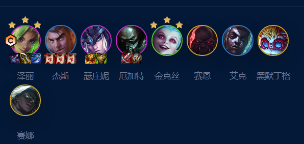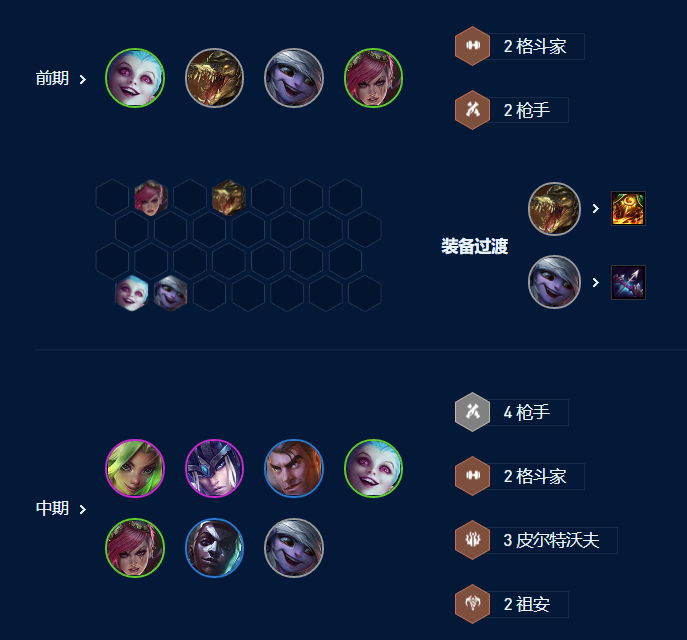 开局留枪手牌,可以用2枪手+2斗/2过渡。3-2升6人口,拿杰斯/艾克开3皮尔。祖安装备给金克斯。