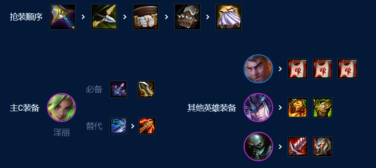 优先做出轻语+双基克打过渡。后面同时补出前排的肉装和泽丽的输出装。多余的装备再养螃蟹。