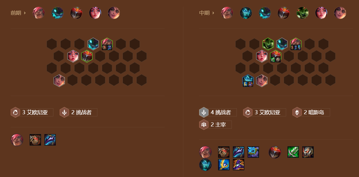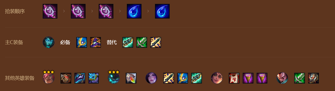 前期装备先给前排装,搭配两主宰四挑战三艾欧能平稳发育。