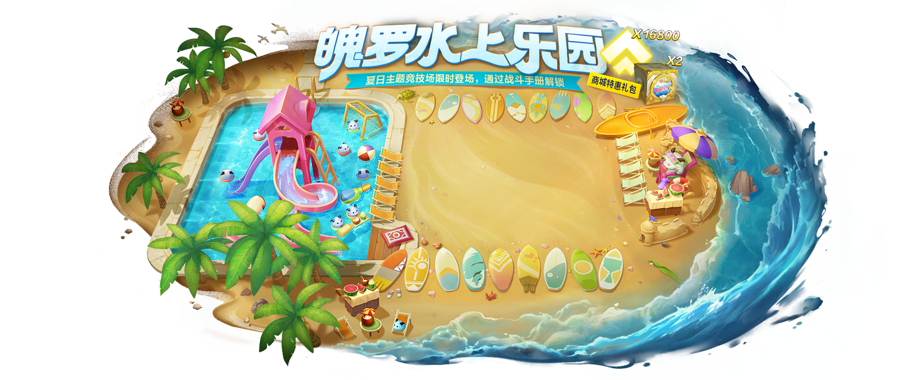 水上乐园豪华礼包: 购买可立即解锁16800战斗手册经验 ,附赠2个水上乐园幸运礼盒,售价16800点券,永久限购2个。