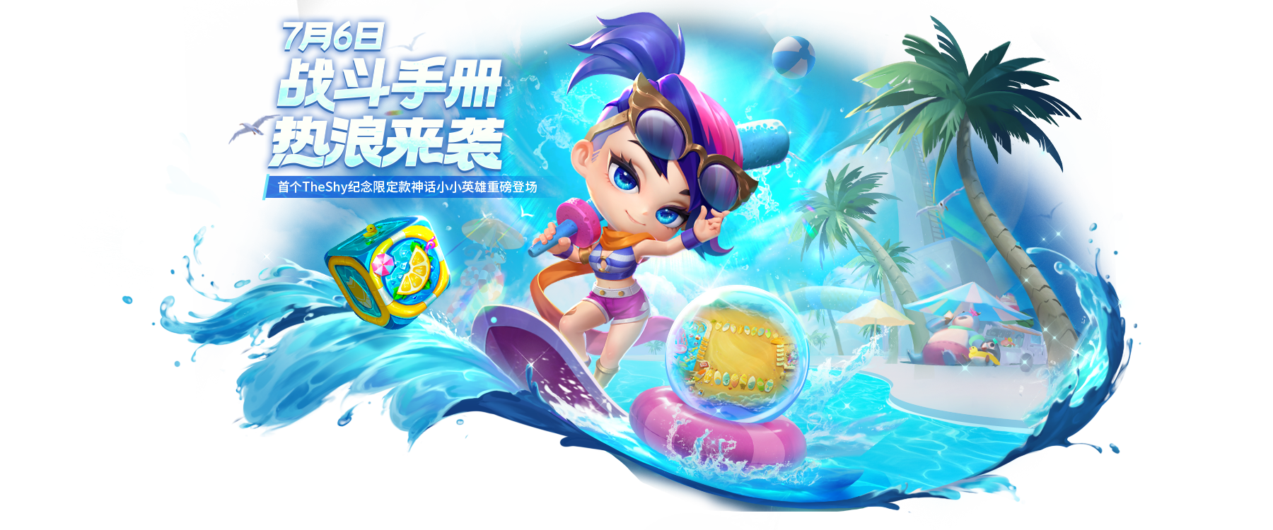 7月6日更新后10月17日,全新小小英雄 【泳池派对-小小菲奥娜-TheShy纪念限定】、【泳池派对-小妮】、【泳池派对-小飞吉】、【泳池派对-团子】及全新竞技场【魄罗水上乐园】加入【战斗手册】!