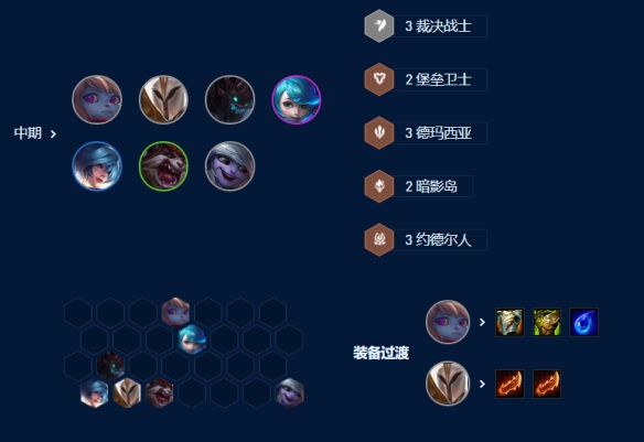 在5人口搜出三星天使、波比、大树后升6人口开出3德玛3约德尔2裁决羁绊。7人口建议补格温或劫开3裁决。7人口不D牌。如果有大连胜且血量优势,可以考虑直接升9人口,这样天使两次登神,吃鸡概率最大。如果中期被断连胜,容错不高,建议在8人口搜大头、皇子、格温和剑魔,去替换掉阵容低费卡。大头替换小炮、皇子替换琴女、格温和剑魔直接上场。