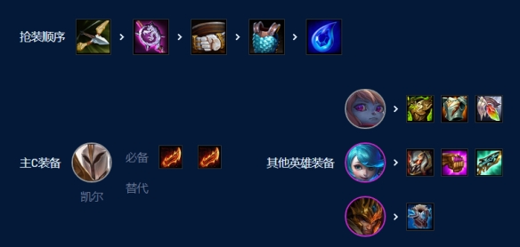 天使:双羊刀+3德玛光明装备波比:板甲、救赎、狂徒。皇子冰甲。后面补格温三件套。如果天使羊刀只能做一件,第二件可以换科技枪/法爆。如果对局火炮亚索多,天使比较难活,可以不要光明装备,第三件补个夜刃防亚索,光明装备让皇子吃。