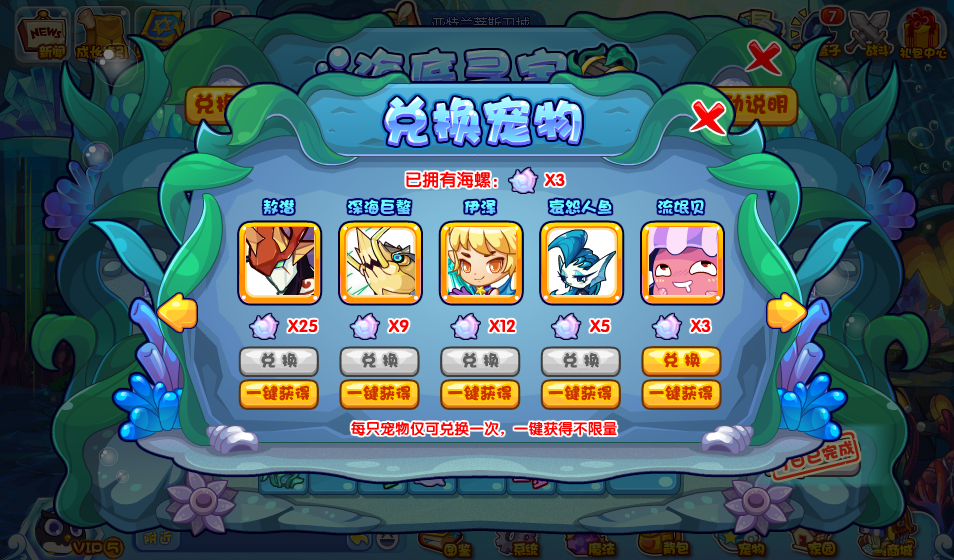 抵达终点可以开启终极宝箱,获得海螺,开启后会重新开始。同时每日签到也可以拿到一个海螺,累计一定数量的海螺,就可以兑换宠物啦: