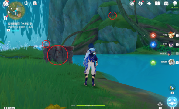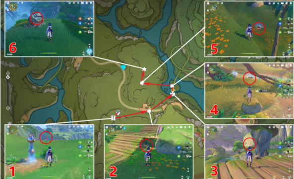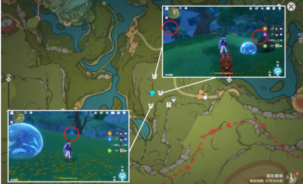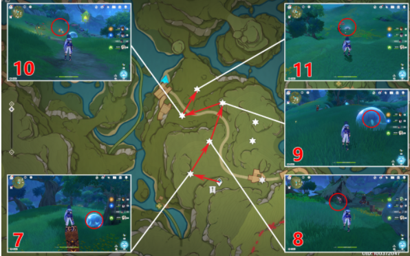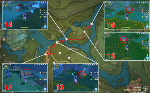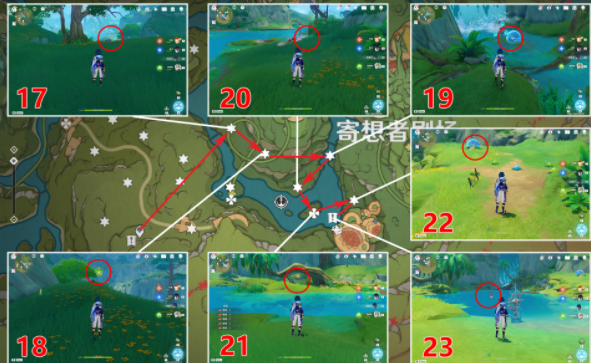 2、寄想者西,第7个找出三个幻灵藏着下图位置找到之后再激活3个方碑即可(具体如下),第9个击败对面的丘丘人,调查箱子即可,第11个击败西北的丘丘人,再借助草种子激活草灯笼;