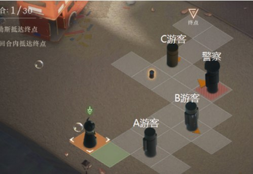 ③这个时候C游客就会把警察给一直拦在那个为止无法行动,我们就趁这个机会直接一口气走到终点,最终用了14个回合就到终点了。