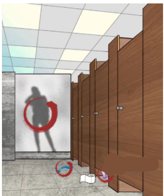 3、出来后的场景,先不急着找东西,先点最右边的隔间们,把里面的卷纸拖到女鬼在的隔间前面,然后点击人影、脚印、女鬼的脚,选择藏起来,即可通关。