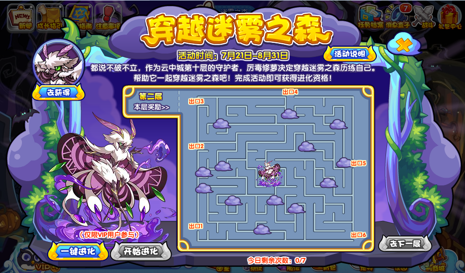 都说不破不立,作为云中城第十层的守护者,厉毒修萝决定穿越迷雾之森历练自己。帮助它一起穿越迷雾之森吧!完成活动即可获得进化资格!(本活动仅限vip用户参与 )