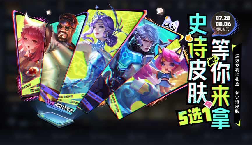 本次可以免费领取史诗皮肤的活动叫做「羁绊之旅、峡谷再续」,该活动7月28日上线,8月6日结束,完成任务后,玩家可以获得一个史诗皮肤自选宝箱,在这个宝箱内有5个免费得史诗皮肤任选,他们分别是: