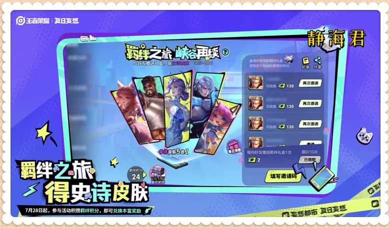 活动期间,通过邀请好友回归王者峡谷获得羁绊积分,累计羁绊积分达到指定数值获得羁绊之旅头像框和史诗皮肤5选1宝箱!回归的召唤师可以获得专属羁绊礼盒哦~