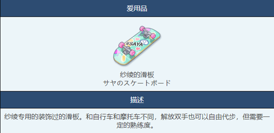 蔚蓝档案这个二次元射击游戏里面有很多特殊道具是通过角色来获取的,就好比纱绫的滑板这个道具,需要玩家们提升自己跟纱绫(私服)的好感度。小编就为大家详细解答一下具体滑板的作用是什么吧!