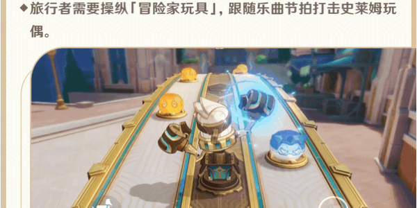 2、「跃动节拍响应法」玩法中,旅行者需要操作道具【冒险家玩具】,跟随音乐的节拍,攻击各种史莱姆玩偶。