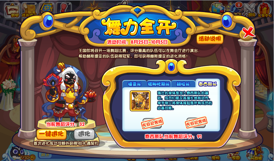 四支队伍一同学习挑战下来可以拿到32分;既然说到舞蹈评分,那么我们最终目的就是需要赫斯提亚在四支队伍中夺得头筹,拿下舞蹈评分之最,就能开启:赫斯提亚进化资格啦!