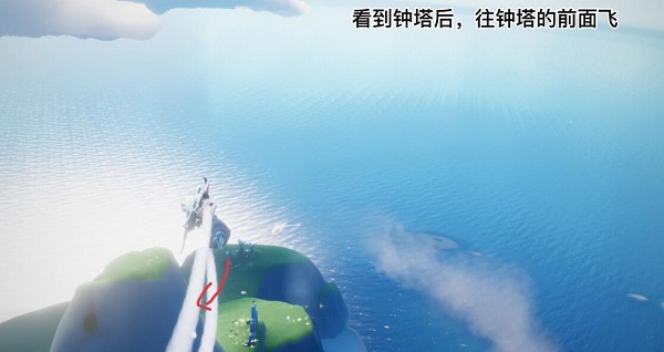 2、接着就会看到钟塔,这时向着钟塔的前面飞。