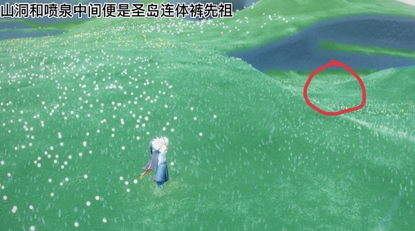 3、最后在山洞口和喷泉中间的位置处就可以找到连体裤先祖了。