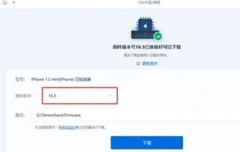第 2 步:在支持降级系统的界面,工具将会显示此iPhone支持降级到的正式版系统,再点击“下载固件”,等待固件下载完成。