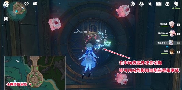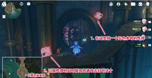 位于下图所示位置墙壁上,先在右上角小小恶棍旁边放置「异色水母」的炸弹,之后自己靠近左下角这个,在按E引爆炸弹的同时自身通过普通攻击打破另一个,即可将它们同时击破,使此处排水口恢复。