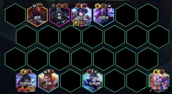 1、阵容组成:艾希、索拉卡、杰斯、塔里克、厄斐琉斯、瑟庄妮、慎、塞恩