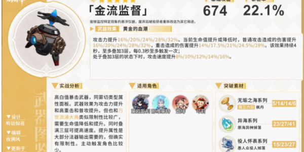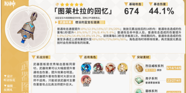专武是我们优先考虑的武器,该武器的各个加成效果都十分契合莱欧斯利,且22.1%的暴击率加成使得即使搭配逐影4件也不必过于担心暴击率溢出,此时可选择暴伤头冠,依靠圣遗物的副词条堆叠暴击率。