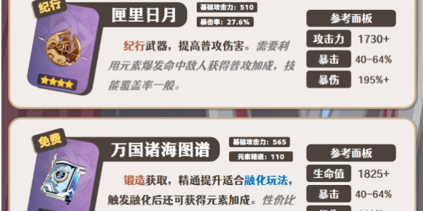 莱欧斯利触发融化反应后提高自身冰伤,万国诸海图谱是前中期性价比较高的选择。匣里日月需要莱欧斯利前置施放元素爆发才能触发该武器的普攻伤害加成,加成时间不能覆盖莱欧斯利的输出全程。