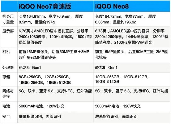 iQOONeo7竞速版和iQOONeo8产品配置对比