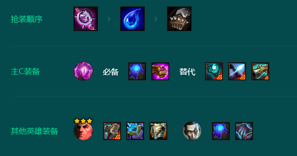阵容可拿1-2件奥恩装备。大眼做回蓝+法爆两件,第三件可选冥火/狙击手/收集者。乌鸦离子必备,第二件做狂徒或做板甲单抗。奥恩装备拿破舰者/绿甲/永霜。诡术师之境拿了可以过度,后续给皇子。魔蕴可以给希尔科或替换大眼的回蓝装。