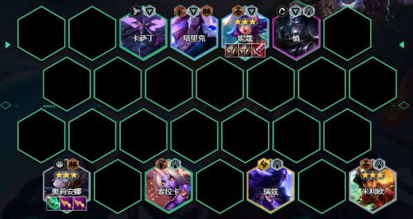 1、阵容组成:发条、米莉亚、索拉卡、塔里克、妮蔻、慎、卡萨丁/奎桑提、瑞兹