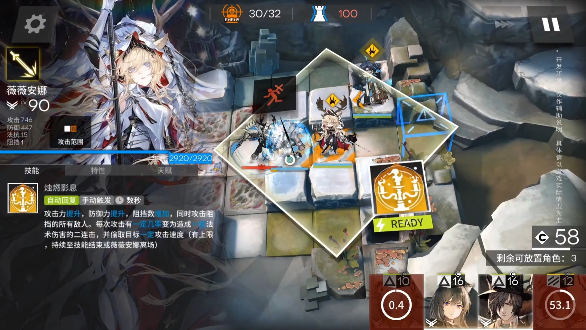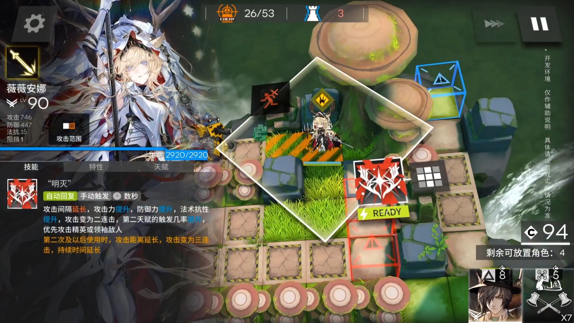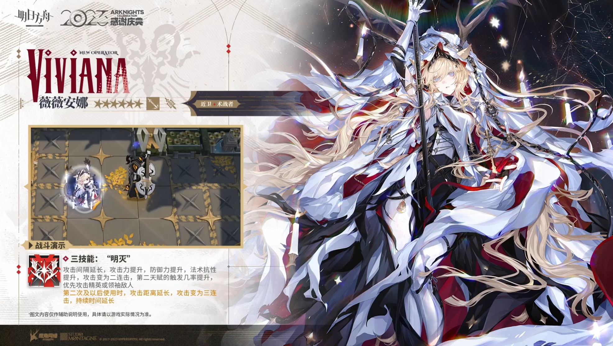 攻击力提升,防御力提升,阻挡数增加,同时攻击阻挡的所有敌人。每次攻击有一定几率变为造成一定法术伤害的2连击,并偷取命中目标一定攻击速度(有上限,持续至技能结束或薇薇安娜离场)