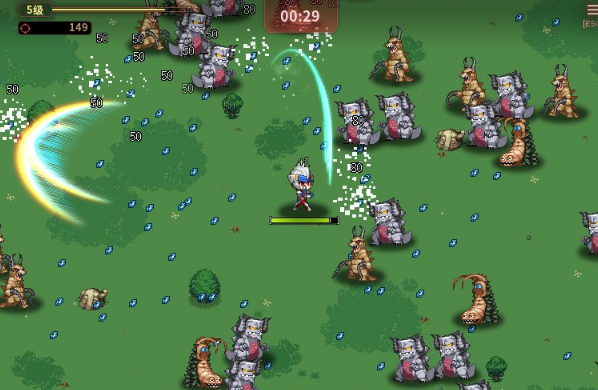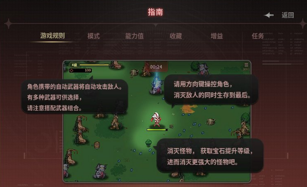 2、玩家可自主搭配武器组合,角色自动打怪,玩家用方向键控制角色移动和躲避,消灭怪物后获得宝石,提升战斗等级,不断越级挑战,就能轻松通关。