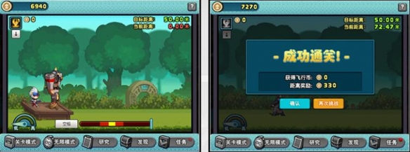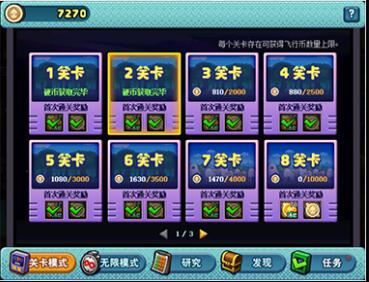 4、小游戏分为关卡模式和无限模式,关卡模式共有24关,每周开放8关,只要在关卡模式内把怪物发射出固定的距离,就可以获得本关的首通奖励,获得怪兽向前飞硬币和飞行币,在关卡通关后,再次进入并获得还可以获得少量的飞行币,但是每个关卡都有获得的飞行币上限,达到上限后就不会再获得任何通关奖励了。