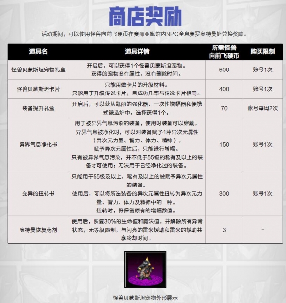 活动奖励:怪兽贝蒙斯坦宠物礼盒、怪兽贝蒙斯坦卡片、装备提升礼盒等。
