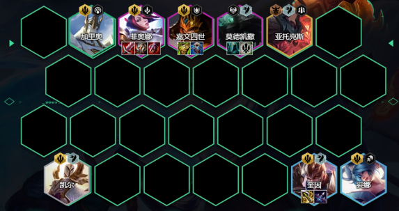 1、阵容组成:加里奥、天使、娑娜、奎因、剑姬、皇子、莫德凯撒、亚托克斯