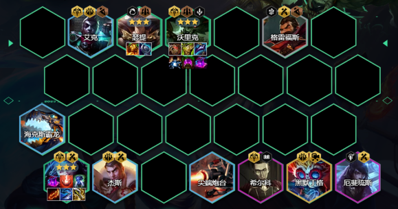 1、阵容组成:男枪、金克丝、沃里克、艾克、瑟提(没3星换泰坦或者剑魔)、杰斯、亚飞、大头