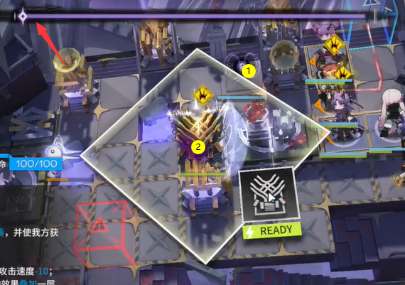 如图所示,等到我方可以操控后,在1号位置摆放湮灭之相(就是刚刚时间到了消失的那个),然后等到音乐进入忧郁风后开启装置改为激昂风格,接下来挂机别动就行了。