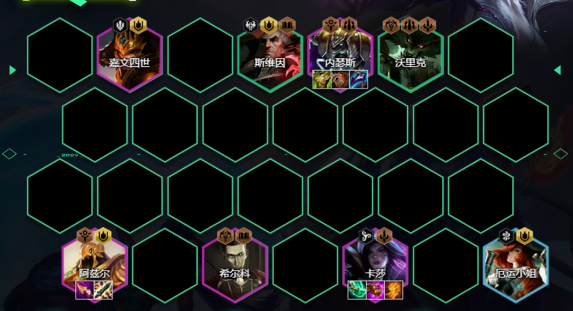 1、阵容组成:斯维因、沃里克、女枪、卡莎、嘉文四世、内瑟斯、阿兹尔、希尔科