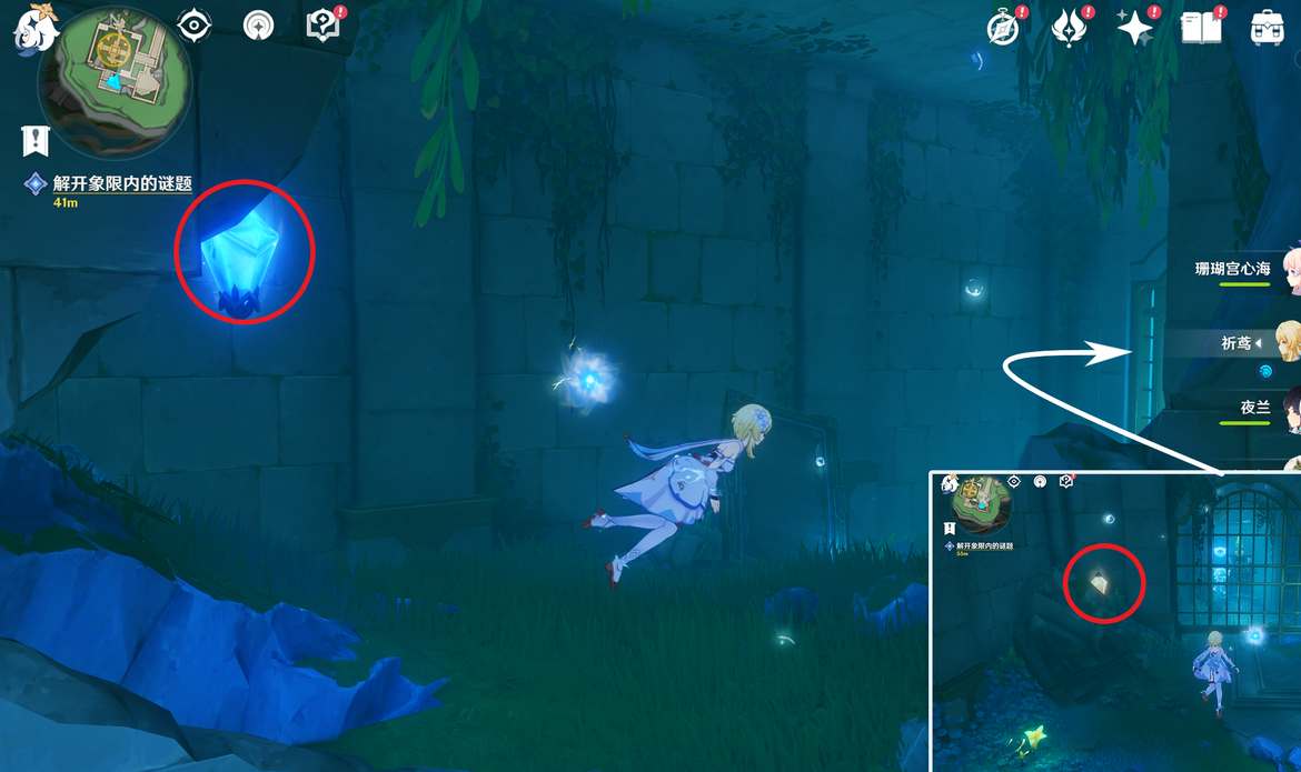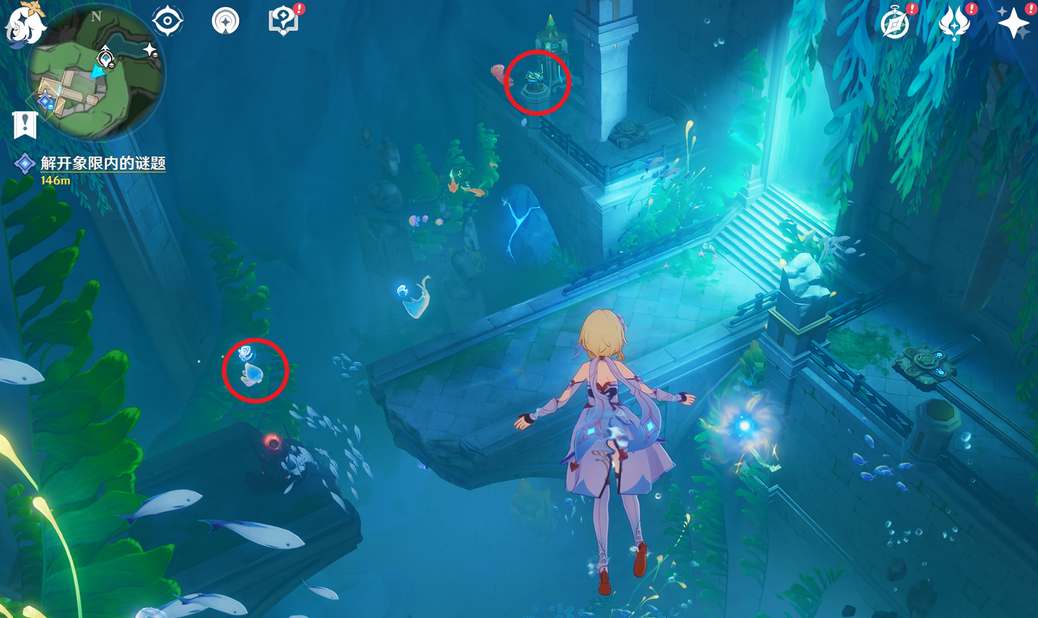 3、潜到水下向西游进入水下洞窟,利用章鱼的力量为遗迹大门两边放流:右边的直接放流,左边旋转机关180°后再放流。