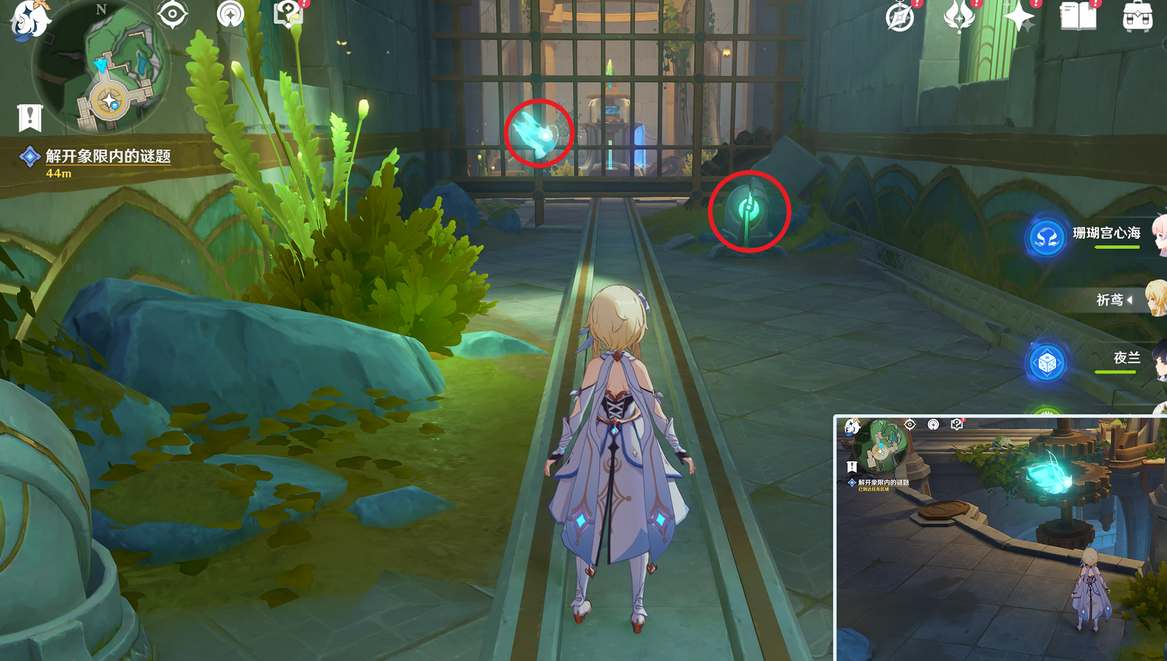 7、进入象限房间,在东部操作升降柱,将左边的升降柱降到底,再降右边的升降柱开启铁门。