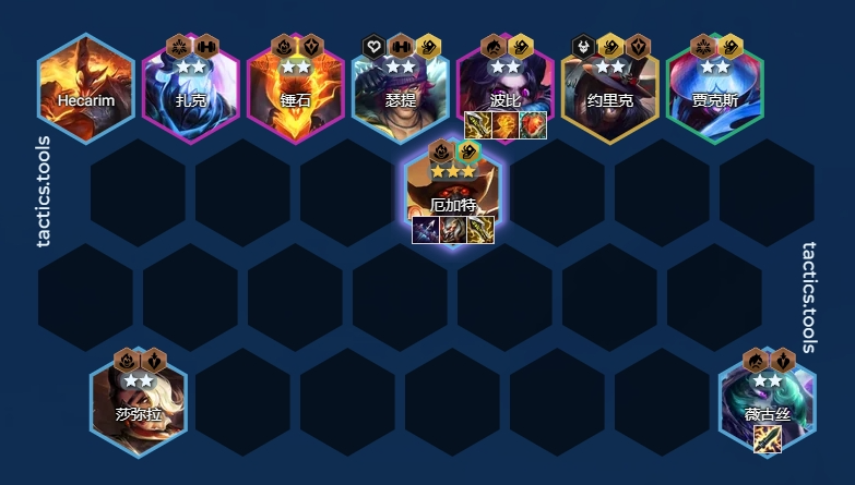 9人口可以调整上3乡村,同样也是因为锤石的控制非常好用,如果不想躲开乡村也补别的五费卡替换莎弥拉,这样战斗会更加,辅助的琴女等五费卡在9级追到两星都可以拿来用。