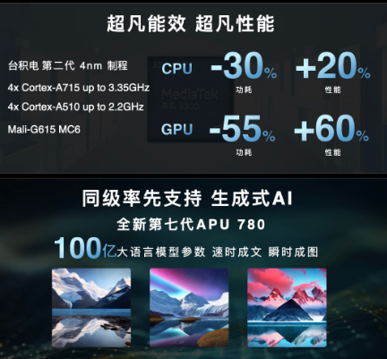 天玑8300是一款5G生成式AI移动芯片,采用台积电4nm制程工艺,拥有出色的性能和能效表现。CPU部分采用了4+4架构,包含1颗3.35GHz A715超大核、3颗3.2GHz A715大核以及4颗2.8GHz A510小核,拥有强大的计算能力和多任务处理能力。同时,该芯片还配备了高效的AI处理器,可以加速语音识别、图像处理等任务,并且支持LPDDR5X内存和UFS 3.1存储,可带来更快的读写速度和更高的数据吞吐量。