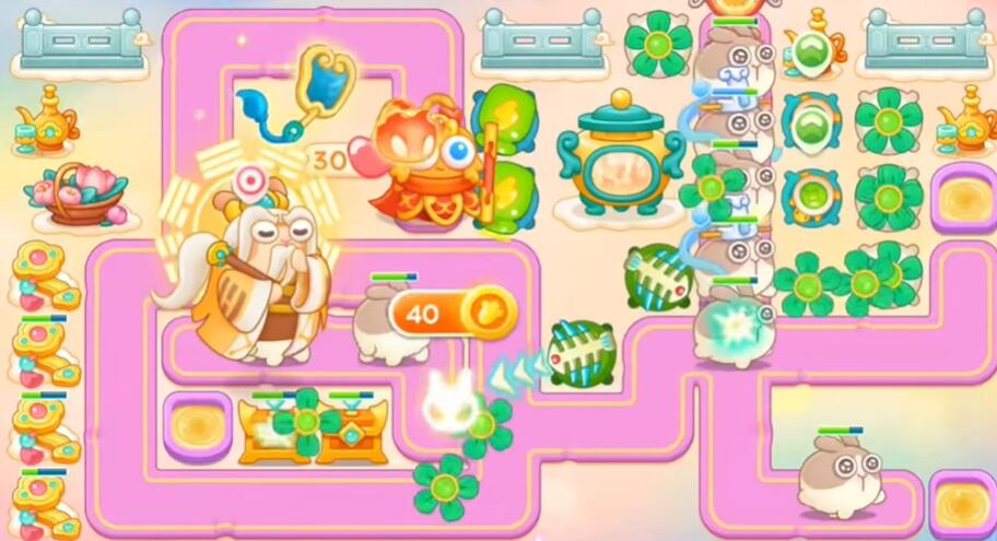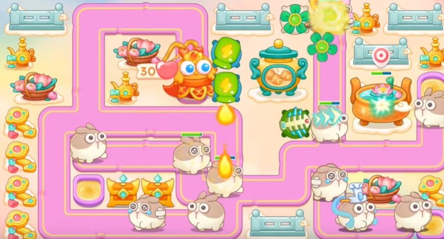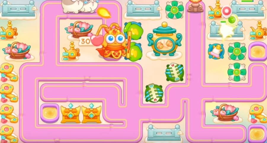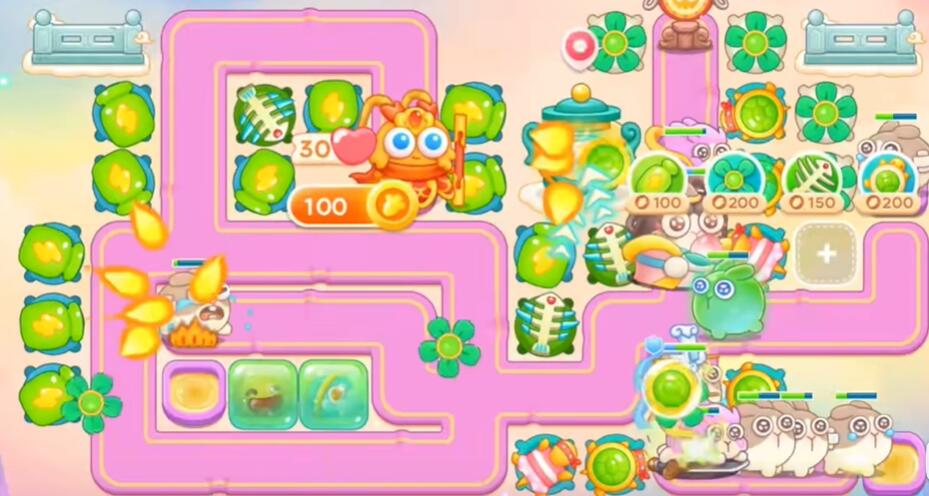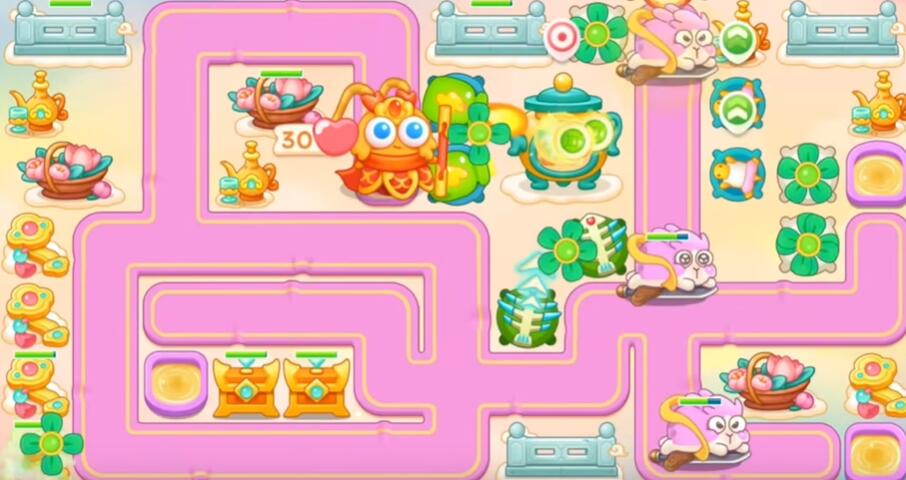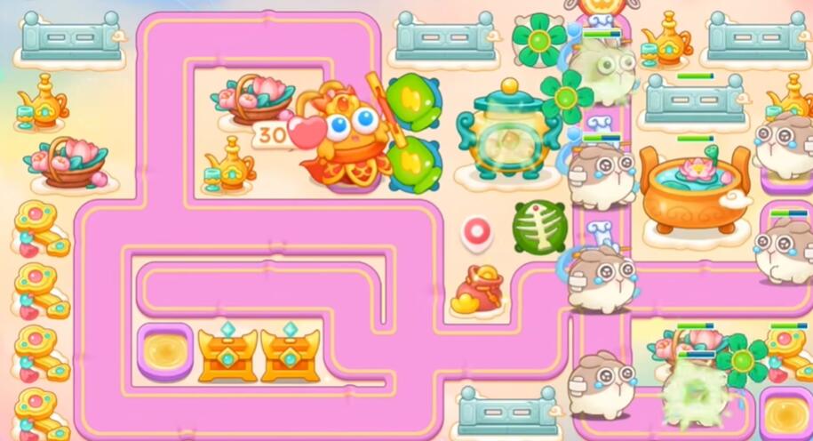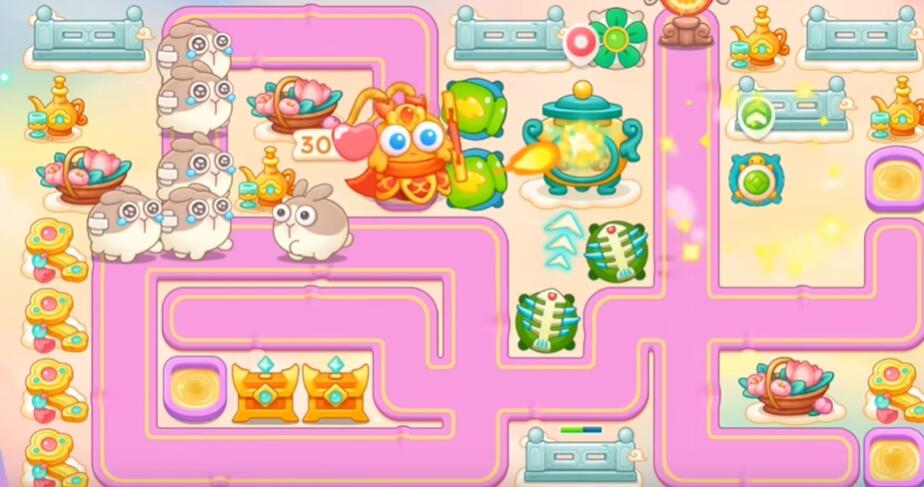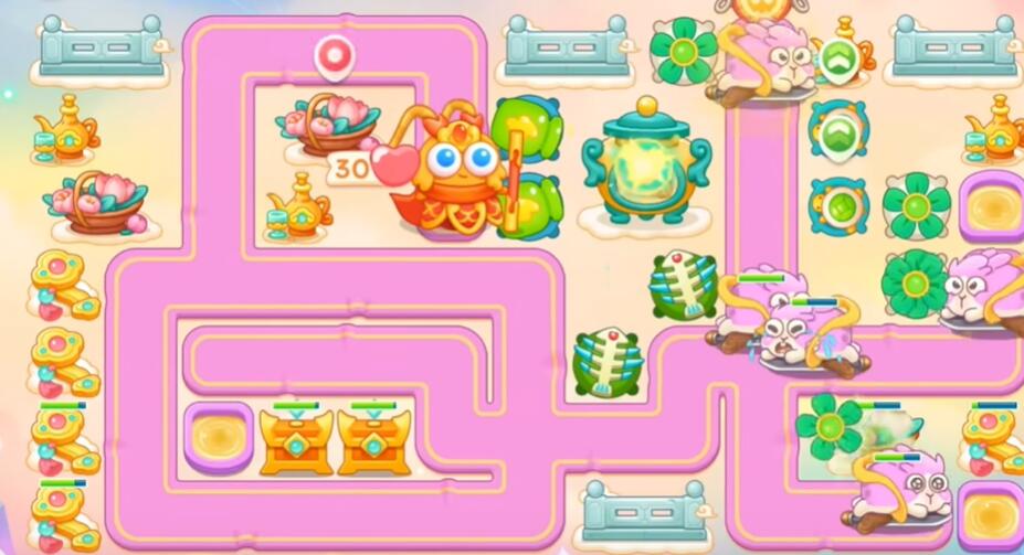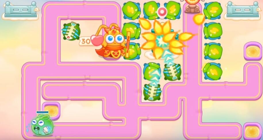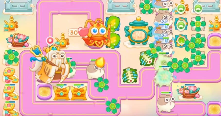7、打花篮和围栏,其他障碍物不要清理,左边和下面不要买炮塔,升级乌龟锁老君。