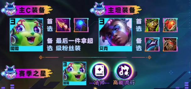1、阵容组成:莉莉娅、凯南、酒桶/萨勒芬妮、艾克、璐璐、妮蔻、娑娜、阿狸