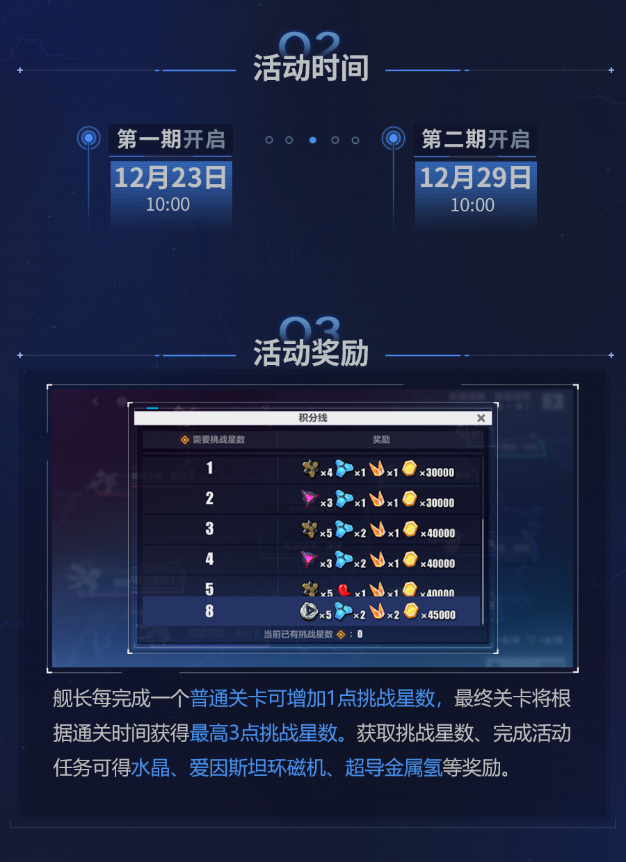 舰长每完成一个普通关卡可增加1点挑战星数,最终关卡将根据通关时间获得最高3点挑战星数。获取挑战星数、完成活动任务可得水晶、爱因斯坦环磁机、超导金属氢等奖励。