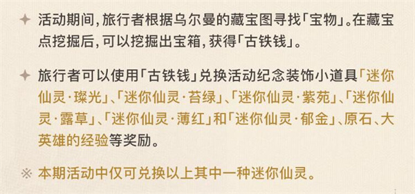 [活动期间,旅行者根据乌尔曼的藏宝图寻找「宝物」。在藏宝点挖掘后,可以挖掘出宝箱,获得「古铁钱」。]