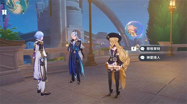 2、传送后往右侧走,可以看到[神里绫人]和[那维莱特],在讨论稻妻和枫丹的合作。